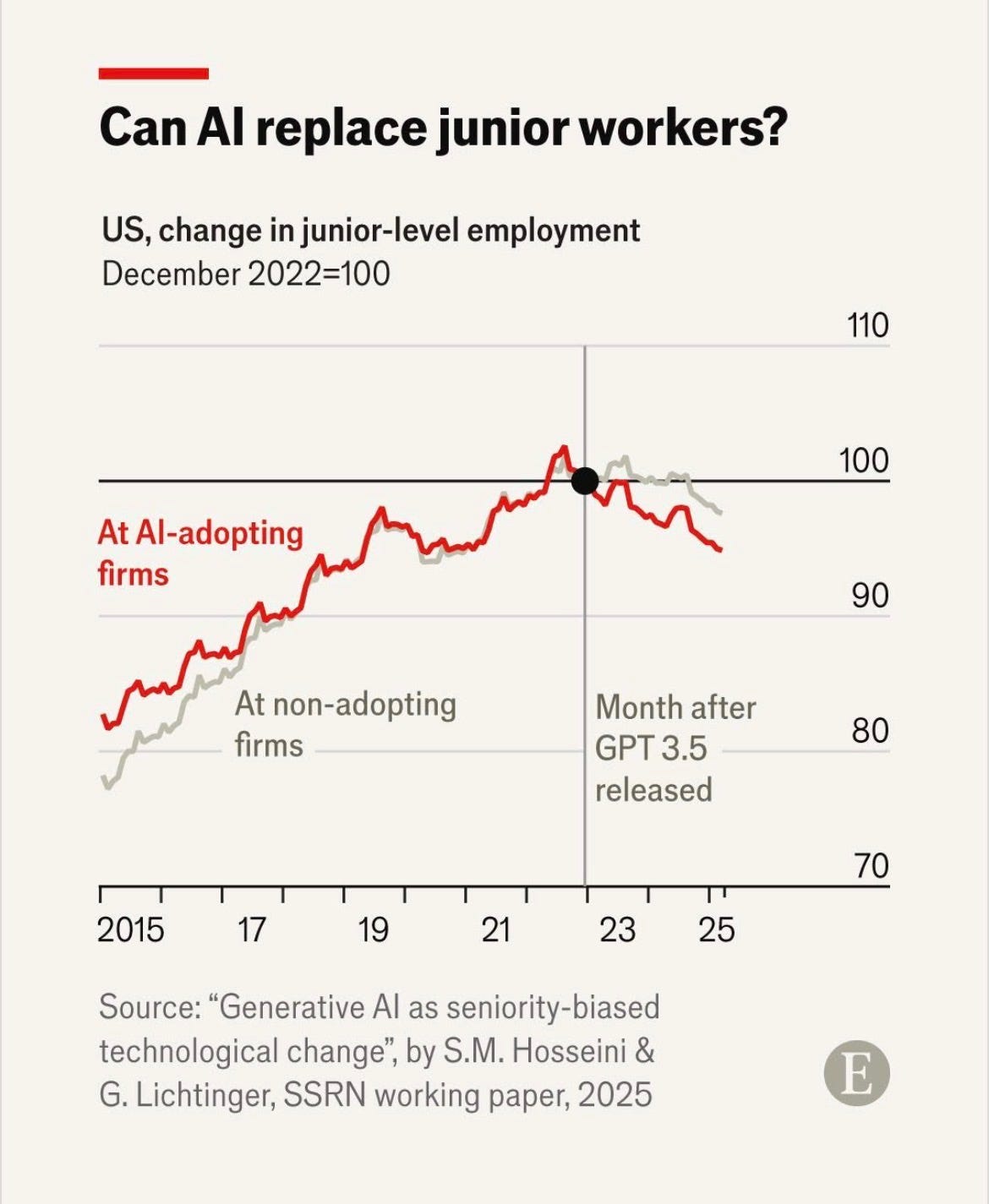 Velmi důležitá data a graf přinesl článek Generative AI as Seniority-Biased Technological Change: Evidence from U.S. Résumé and Job Posting Data od autorů Guy Lichtingera a Seyed Mahdi Hosseiniho z Harvardu, který vyšel začátkem září.
